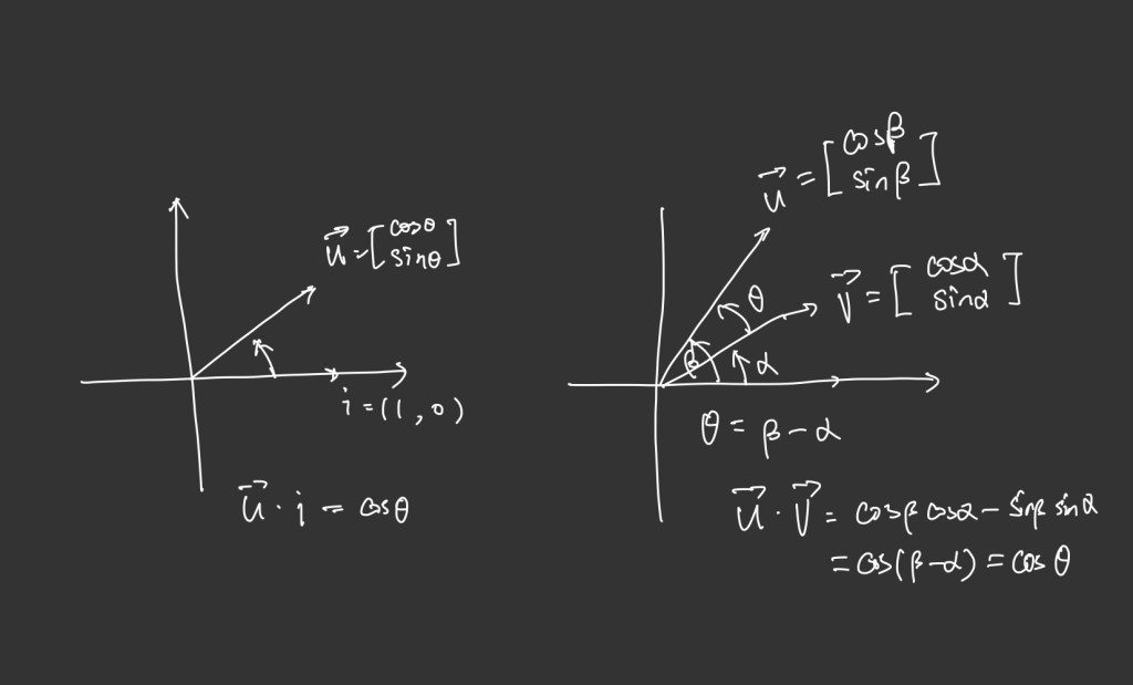 The geometry picture of dot product is the angle between two vectors, and it is cos(theta). The picture below shows when the vectors are u=(cos(theta), sin(theta)), and i=(1,0). The dot product is u dot i = cos(theta). This is the cosine angle between them. For a more general situation, For any arbitrary unit vectors, the vector u=(cos(alpha), sin(alpha)), and vector v =(cos(beta), sin(beta)), with beta=alpha+theta. Their dot product is cos(alpha)cos(beta)-sin(alpha)sin(beta). From the trigonometry this is cos(beta-alpha) = cos(theta).